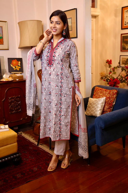 Grey Maroon Block Printed Ethnic Suit