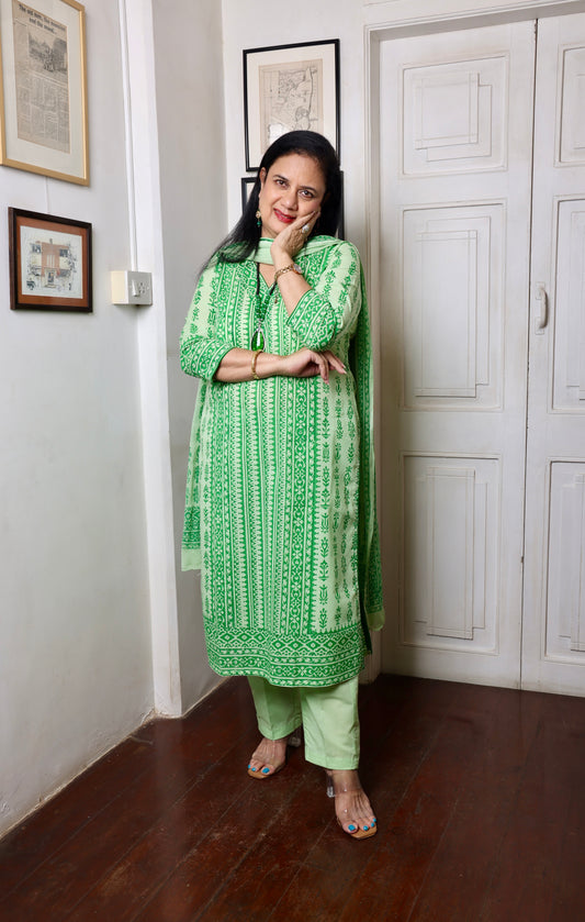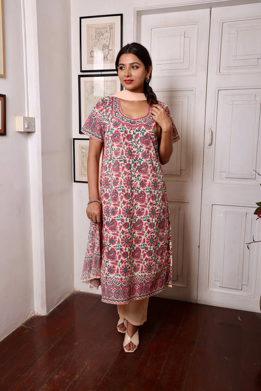 Beige and Orange Block Printed Ethnic Suit