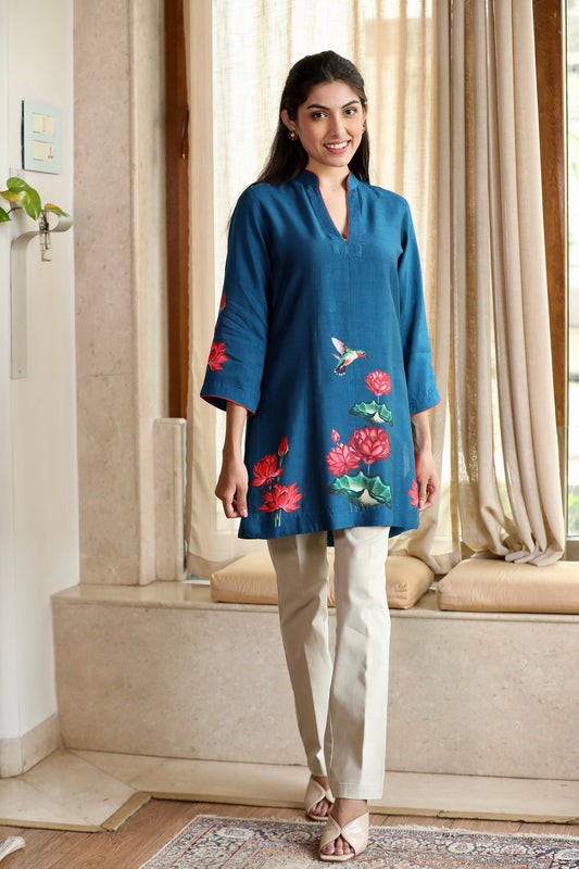 Blue Silk Printed Short Kurti