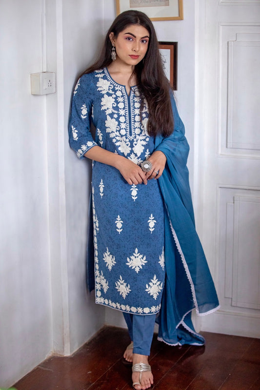 Beige & Blue Pleat Embroidery Yoke Kurti