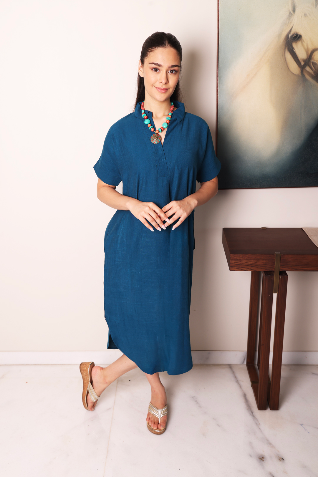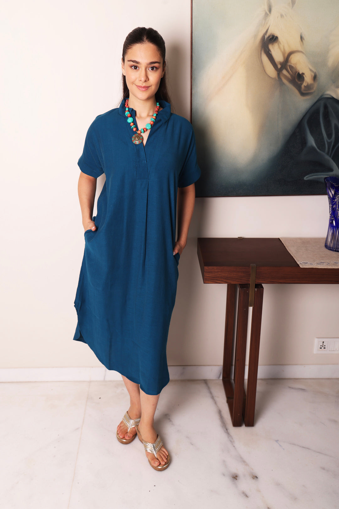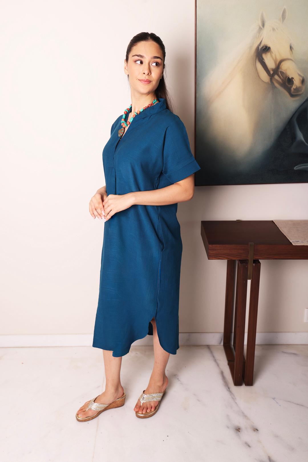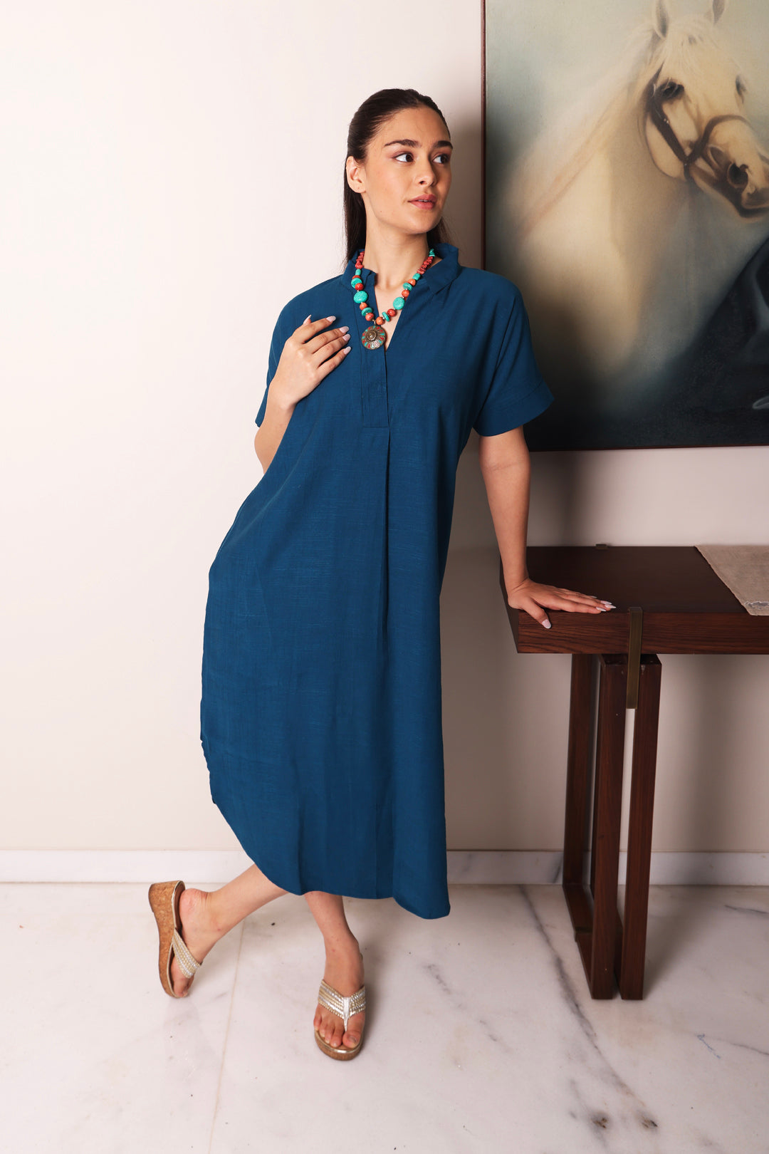 This dark blue plain pleated collar dress in a classic round cut is a timeless wardrobe essential. Its clean silhouette makes it a versatile piece, effortlessly styled for both casual outings and formal occasions. Just add a statement necklace and heels, and you're ready to step out in style.