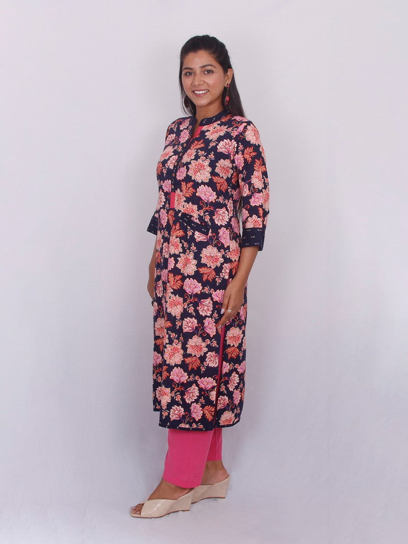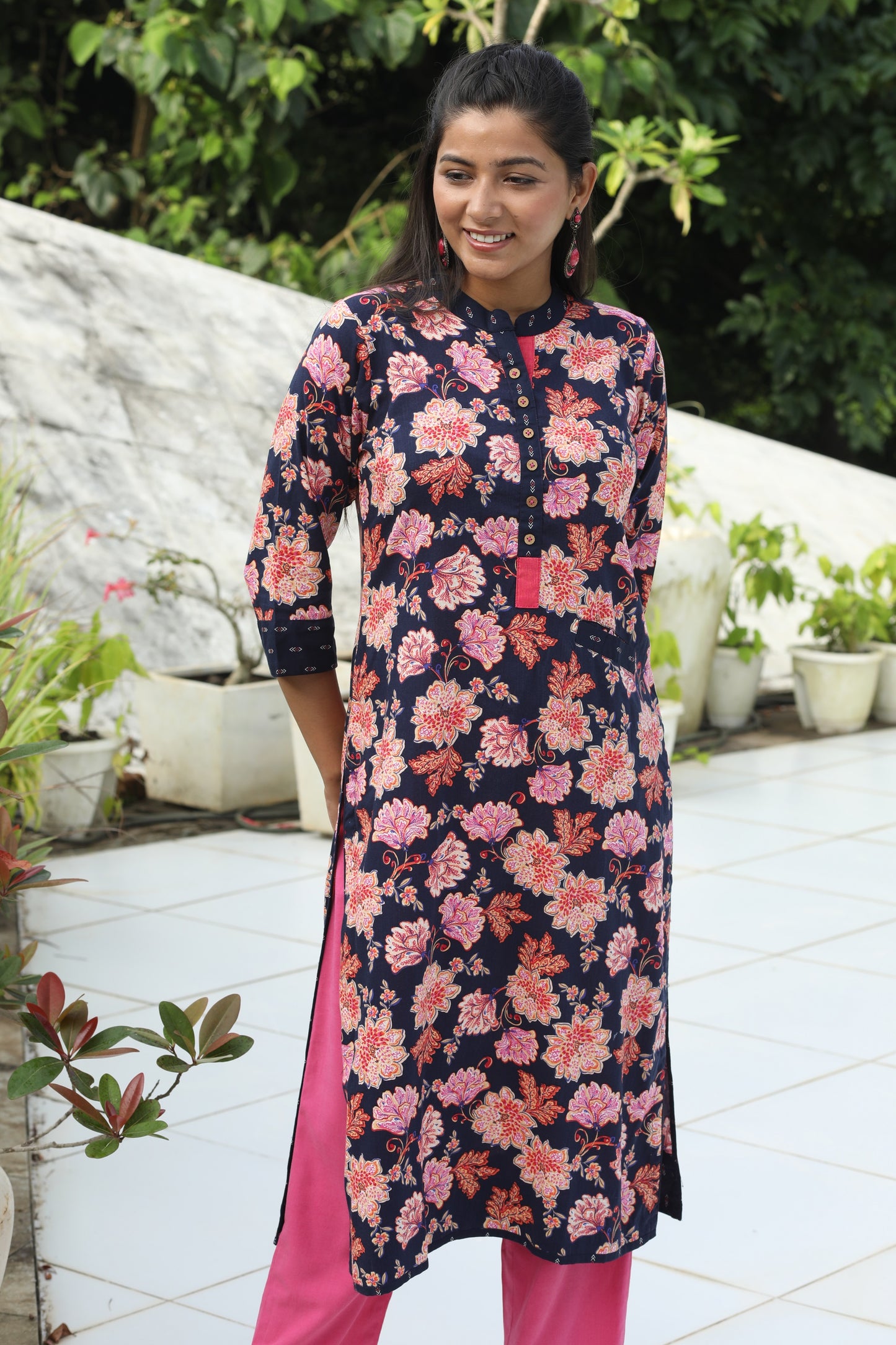 Floral prints can also look formal when adorned with a chinese collar! This 2 print rayon long kurta is perfect for office wear and client meetings. You can pair it with a pant of your choice. Pant is not included.