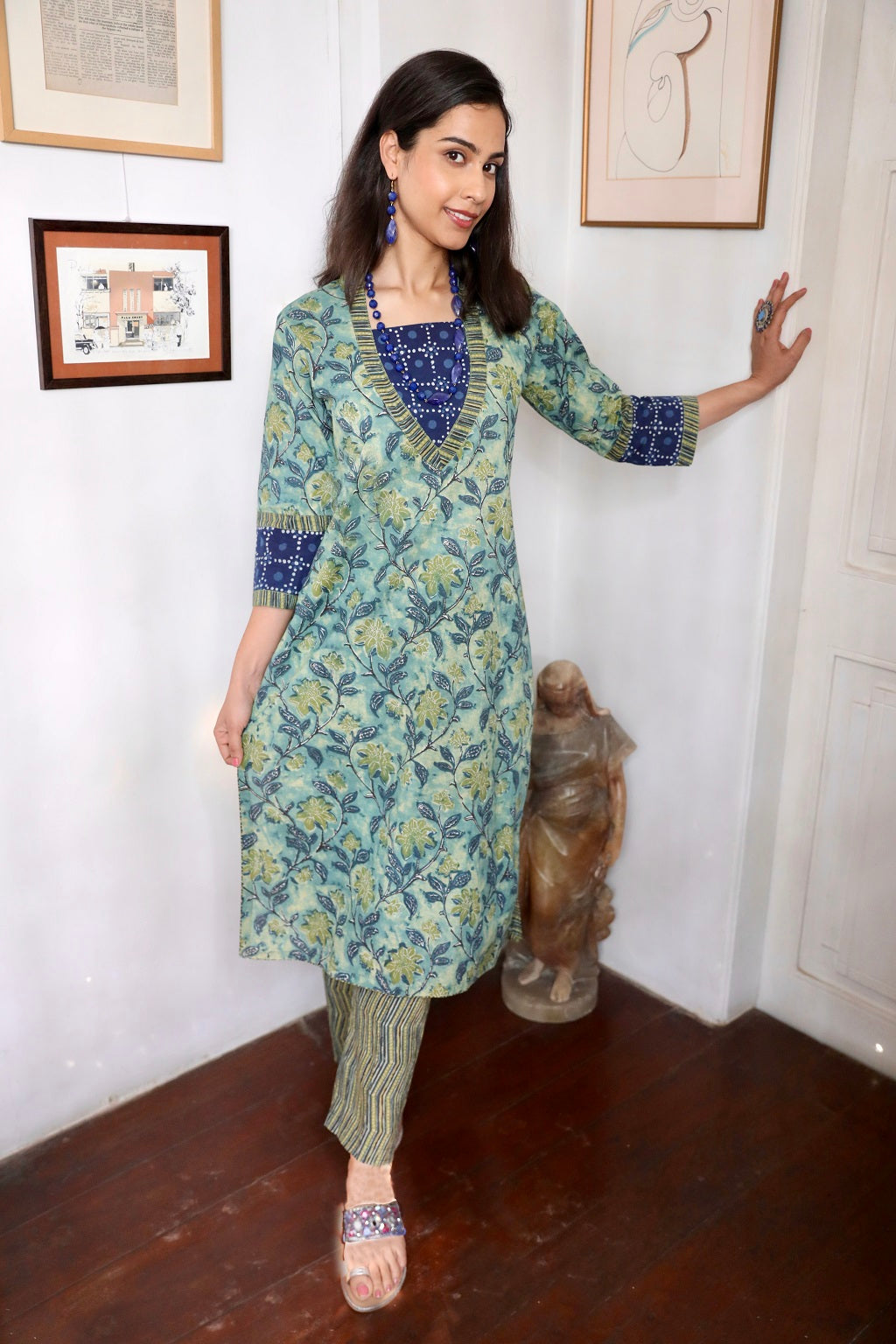 Lean on fresh hues of green and blue with this oh-so-aesthetic suit set! Crafted with body-flattering fabric and a magnificent dhaboo yoke, it is a stunner! This Suit set comes with a straight striped cotton pant.
