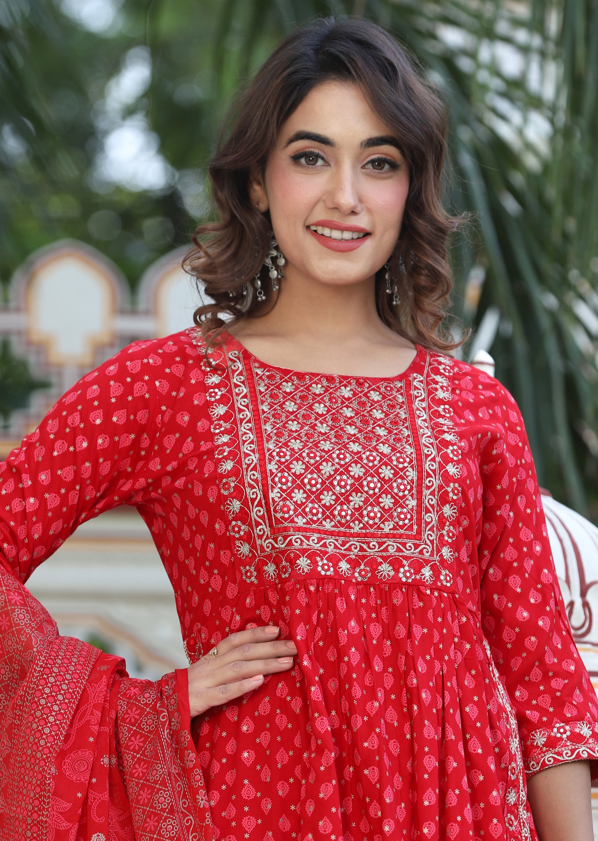 This outfit is a symphony of textures and traditions, blending the comfort of dobby rayon with the timeless elegance of zari and the ethereal beauty of chiffon. Make a statement at any occasion with this perfect amalgamation of style and grace. Inclusive of kurta, pants and dupatta.